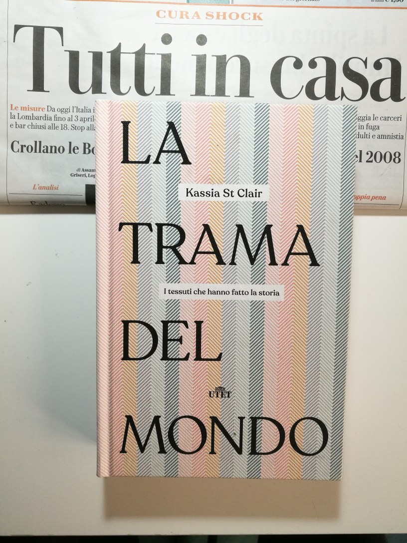 Per la serie #ioleggoacasa ecco un buon compagno di quarantena. Il libro “La trama del mondo” di Kassia St Clair è una lunga dissertazione sulla storia del tessuto o forse sarebbe meglio dire su varie storie di tessuti. Infatti “Viviamo circondati di stoffe” ne siamo letteralmente avvolti ma raramente vi prestiamo attenzione o ci fermiamo a considerare la valenza storica, antropologica delle fibre nelle quali siamo avviluppati. Questo poderoso volume, ce ne offre l’occasione. Si parte analizzando i primi resti archeologici di materiale tessile mai rinvenuto fino ad arrivare alla composizione delle tute spaziali o dei costumi utilizzati dai nuotatori durante le olimpiadi, passando per le tombe egizie, i mercati inglesi nel medioevo, la corte di Luigi XIV, le scalate al monte Everest, le poderose vele vichinghe. Insomma un viaggio sbalorditivo, un libro dal taglio divulgativo, senza disdegnare qualche approfondimento tecnico sul mondo del tessuto. Anche il libro in se è un piccolo gioiello, copertina rigida, pagine ampie e spesse, grafica curata, forse troppe poche immagini per essere un libro sul tessuto, ma per il resto il signor Utet ha fatto un gran bel lavoro.