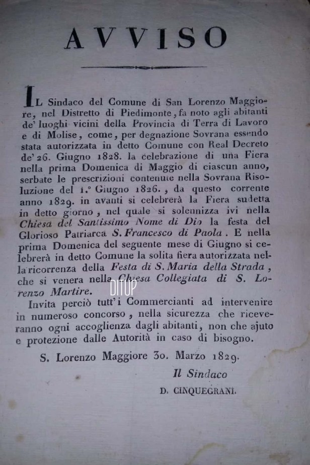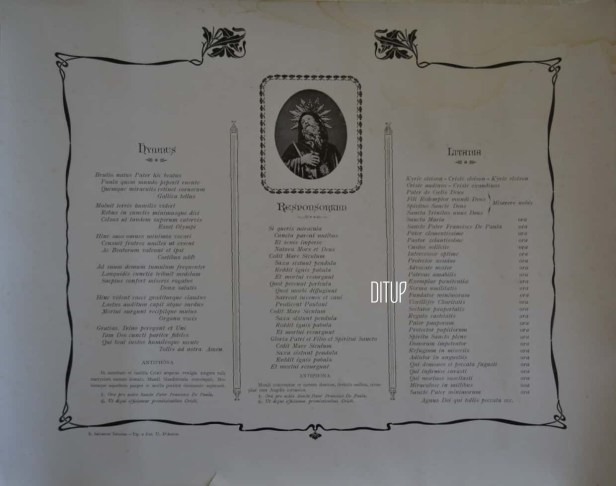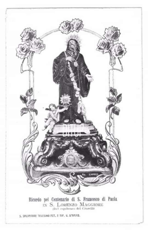 Notizie certe circa una festa dedicata a questo Santo a San Lorenzo Maggiore, si hanno a partire dal 1829, quando per la prima volta si tenne una fiera in suo onore, la prima domenica di maggio. Se infatti la memoria liturgica di San Francesco di Paola, cade il 2 aprile, i festeggiamenti sono spesso posticipati ai primi giorni di maggio così da non interferire con il rigoroso periodo quaresimale e commemorare la canonizzazione del santo, avvenuta il 1 maggio 1519. A San Lorenzo, la fiera era preceduta dalla pratica dei tredici venerdì in onore di Francesco di Paola a cura della famiglia Cinquegrani, recitati nella chiesa del SS. Nome di Dio. Ancora oggi, in questa chiesa si conserva l’antica statua del Citarelli che lo raffigura secondo l’iconografia classica. A testimonianza della particolare devozione che legava i nostri antenati a questo santo, possiamo ammirare gli ex voto immortalati assieme alla statua nella prima metà del XX secolo in alcuni santini votivi, come quello che segue.