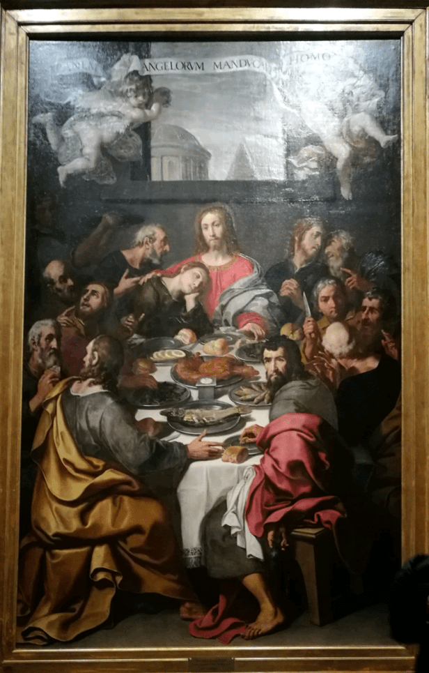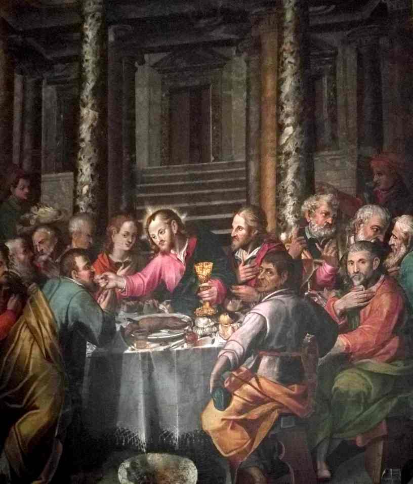 Le immagini che raffigurano l’ultima cena di Gesù con gli apostoli, sono spesso ricche di particolari e cariche di elementi simbolici. Il fulcro dell’evento è l’istituzione dell’Eucarestia, ossia il gesto di spezzare il pane e condividere il vino, presentati dal Cristo come suo Corpo e suo Sangue. Tuttavia, la maggior parte delle opere che rappresentano la Cena, catturano i momenti appena successivi alla celebre citazione evangelica: “Uno di voi mi tradirà” (Giovanni 13,21). Ricostruiamo la scena. Gesù sta mangiando con i dodici, dopo la “Lavanda dei piedi” tramandata da Giovanni. Durante la cena annuncia che a tavola con lui è seduto l’uomo che lo tradirà. I discepoli allora sono presi da agitazione e sgomento e iniziano a chiedere chi sia il traditore. Ecco, la maggior parte delle raffigurazioni di quella cena si concentrano su questo momento. Abbiamo tutti davanti agli occhi la scena del Cenacolo (1494-1498) di Leonardo da Vinci a Milano e quel concerto di gesti interrogativi che caratterizza i discepoli. Altro esempio del genere è, sempre a Milano, la tela di Daniele Crespi, databile al 1630 e conservata nella pinacoteca di Brera.