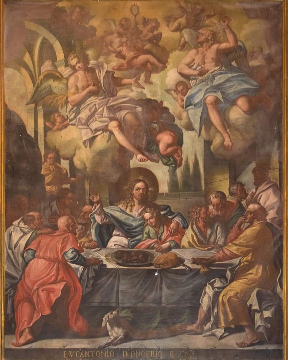 Il traditore, Giuda ovviamente, è forse la figura più celebre delle pagine di Vangelo che tramandano di quella cena. Proprio in virtù del suo ruolo di co-protagonista, Giuda deve essere ben riconoscibile nella rappresentazione. Come evidenziarlo nel gruppo dei commensali del Cristo ? Domenico Ghirlandaio nell’opera del 1480 conservata a Firenze nel Cenacolo di San Marco, lo raffigura di spalle rispetto allo spettatore, di fronte a Gesù che siede affiancato dagli altri discepoli. Giuda è emarginato, pronto a precipitarsi nelle tenebre del peccato del quale si è macchiato. Anche gli evangelisti descrivendo l’uscita di scena del traditore concludono: “Egli, preso il boccone, subito uscì. Ed era notte” (Giovanni 13, 30). Le tenebre fuori dal cenacolo, sono le tenebre dell’uomo sopraffatto dal peccato. Certo la collocazione isolata di Giuda lo rende immediatamente identificabile, ma non sempre si è scelta questa strada per evidenziarne la presenza, spesso evitando di collocarlo al centro dell’opera, per ovvie ragioni. Non è così ad esempio nelle due opere milanesi delle quali abbiamo parlato in precedenza. In questo caso però, un particolare iconografico viene in soccorso dello spettatore. Si tratta del sacchetto contenente quei “Trenta denari”, l’amaro bottino di Giuda per la vendita di Gesù ai suoi aguzzini. Nell’affresco di Leonardo, l’Iscariota seduto tra Pietro ( che impugna un coltello con il quale ferirà un soldato durante l’arresto di Gesù) e Giovanni tenta di nascondere la sacca delle monete, nel pugno destro chiuso. Nella tela del Crespi invece, il traditore cela il sacchetto al di sotto del piano del tavolo, premurandosi di collocarlo in bella vista per lo spettatore. Inoltre, in questo caso, Giuda, con lo sguardo rivolto agli astanti, pare ostentare quel bottino che tiene invece al riparo dagli occhi dei suoi compagni. Tuttavia, nell’occhiata furtiva di Giuda è percepibile il rimorso che inizia a montare in lui fino al tentativo disperato di riconsegnare i denari ricevuti e poi al tragico epilogo dell’impiccagione (Una rarissima raffigurazione della morte di Giuda è tra le formelle della straordinaria Janua Maior del duomo di Benevento, XII-XIII secolo). Daniele Crespi non è certo il primo a rappresentare in questo modo Giuda Iscariota. Questo escamotage era un topos figurativo delle opere con questo soggetto, già da parecchi secoli. Tanto è vero che anche in tanti piccoli paesi italiani abbarbicati alle Alpi o agli Appennini, lontani dalle grandi corti e troppo poveri per ingaggiare raffinati maestri, non è raro imbattersi in opere che ritraggono l’Ultima Cena, nelle quali si conserva questa particolare composizione stilistica che permette a chi sosta davanti al dipinto di rintracciare immediatamente il “frutto della colpa” e addirittura di guardare in faccia il peccatore per eccellenza e magari riconoscersi in lui e correre ai ripari. E’ il caso, ad esempio, della tela opera dell’artista locale Sebastiano d’Abicino realizzata nella prima metà del XVII secolo e conservata a San Lorenzo Maggiore (Bn), nella quale, oltre a Giuda, anche l’apostolo al suo fianco ha lo sguardo rivolto ai fedeli. Quest’ultimo indica se stesso con la mano, particolare che porta a pensare che il viso dell’apostolo non sia altro che l’autoritratto dell’autore. Simile è l’opera di Lucantonio D’Onofrio del 1761, conservata presso la chiesa di San Mauro Martire in Solopaca (Bn). In quest’ultima tela vediamo al centro la scena della cena, ai piedi del tavolo un cane, simbolo della fedeltà, uno dei temi legati alla pagina evangelica dell’ultima cena e in alto, la gloria dell’Eucarestia.