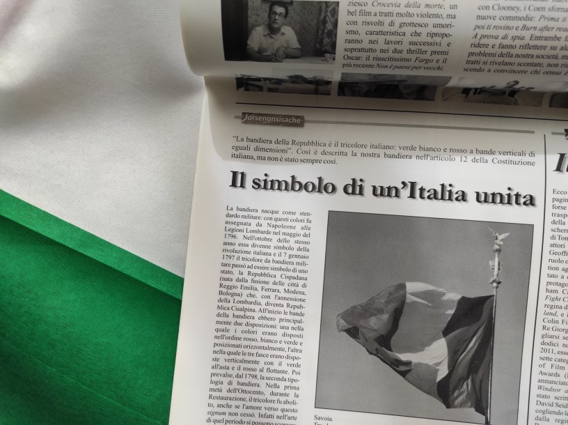 Oggi 7 gennaio, giornata del Tricolore, in ricordo della sua adozione, 224 anni fa, a bandiera di parte del territorio italiano unificato. Sullo sfondo della foto di oggi, la bandiera che ha sventolato dalla mia finestra durante il lockdown, in primo piano un articoletto che scrissi per il giornalino liceale giusto 10 anni fa.