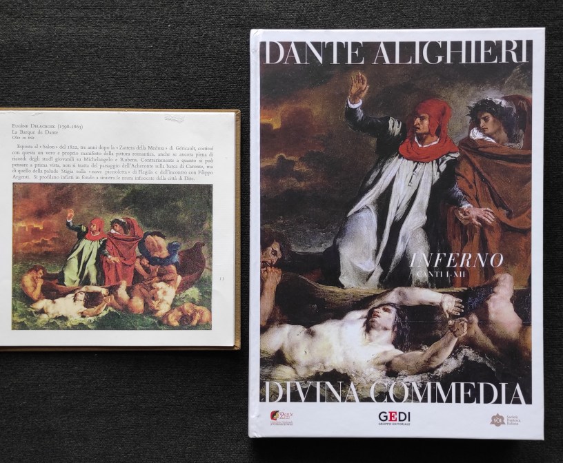 Veniamo all’immagine. È “La barque de Dante” del 1822. Si tratta di un olio su tela di Delacroix (1798-1863) ed è certamente un’ immagine di grande impatto che illustra il passo dantesco nel quale, al canto VIII, la figura dell’ iracondo Filippo Argenti assalta la barca che ospita Dante e Virgilio con il nocchiere Flegias. Dante riconosce la figura del superbo Argenti anche se sfigurata dalla pena e Virgilio lo scaccia quando il dannato pare attaccare il legno che trasporta il poeta.. “Via costá con gli altri cani” dirà Virgilio.