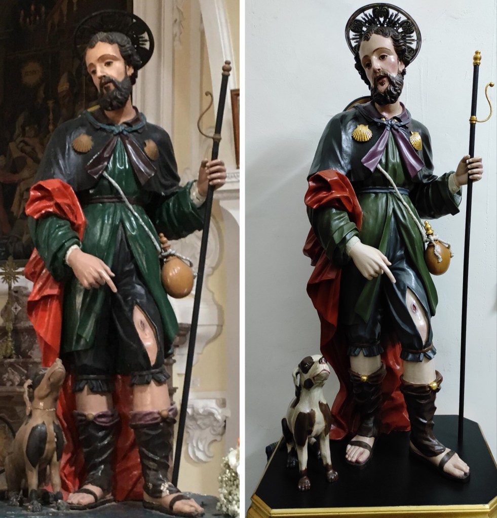 Un’operazione di restauro porta in sé sempre un senso di risarcimento. Risarcimento per le attenzioni negate, per la cura mancata alle opere che chi ci ha preceduto ci ha consegnato. Non a caso, una delle operazioni del processo di restauro è detta proprio Risarcimento, quando si va a colmare il campo vuoto di una tela, una pergamena, una statua. Questo tempo di pandemia è stato ed è certamente un periodo di dolore e angoscia, ma non sono mancati momenti di solidarietà e il desiderio, da parte di molti, di farsi vicini agli altri e far sentire un a carezza con le parole e con gesti concreti. All’iniziale senso di smarrimento, alla sensazione che ci fosse stato rubato del tempo, al desiderio di risarcimento, ha ceduto il passo, in tanti, quella “Cultura della Cura” evocata da Papa Francesco. In altri ancora si è fatta strada la riscoperta di quella fiducia che i nostri avi, in ogni tempo hanno riposto in figure come quella di San Rocco, da sempre invocato come protettore contro i mali contagiosi. L’opera di restauro appena portata a termine quindi, ha il senso del risarcimento e della riscoperta del patrimonio artistico e culturale in genere, tramandatoci dalle generazioni passate. Il Santo di Montpellier è da sempre caro al popolo laurentino, in suo onore fu eretta una chiesa nel 1555. Nel 1877 il pittore A. Pagliara realizzò su commissione la tela, restaurata nel 2017, con protagonisti San Rocco, San Lorenzo e il Bambino Gesù, quando era già stata realizzata questa statua dallo stile tardo settecentesco. Nella scultura lignea vediamo il santo rappresentato secondo l’iconografia classica, l’abito del pellegrino, le conchiglie, il bastone la borraccia, il cappello. Il santo indica la piaga che lo fa protettore contro i morbi pestilenziali e le altre malattie contagiose. Ai piedi il fido cagnolino che quotidianamente, secondo la leggenda, gli portava il pane mentre era malato di peste e quindi costretto in isolamento. Il lavoro di restauro si è svolto in più fasi. In un primo tempo si è provveduto alla pulitura dell’opera e alla rimozione delle ridipinture per far riemergere le cromie originali. Si è proceduto poi alla disinfestazione, al consolidamento del legno, alla sostituzione delle parti mancanti, la stuccature delle lesioni, la reintegrazione pittorica rispettando la tecnica e le cromie antiche. Oggi la statua si presenta tal quale la vollero i nostri antenati, aggiungendo un tassello al recupero delle testimonianze d’arte sacra custodite in parrocchia.